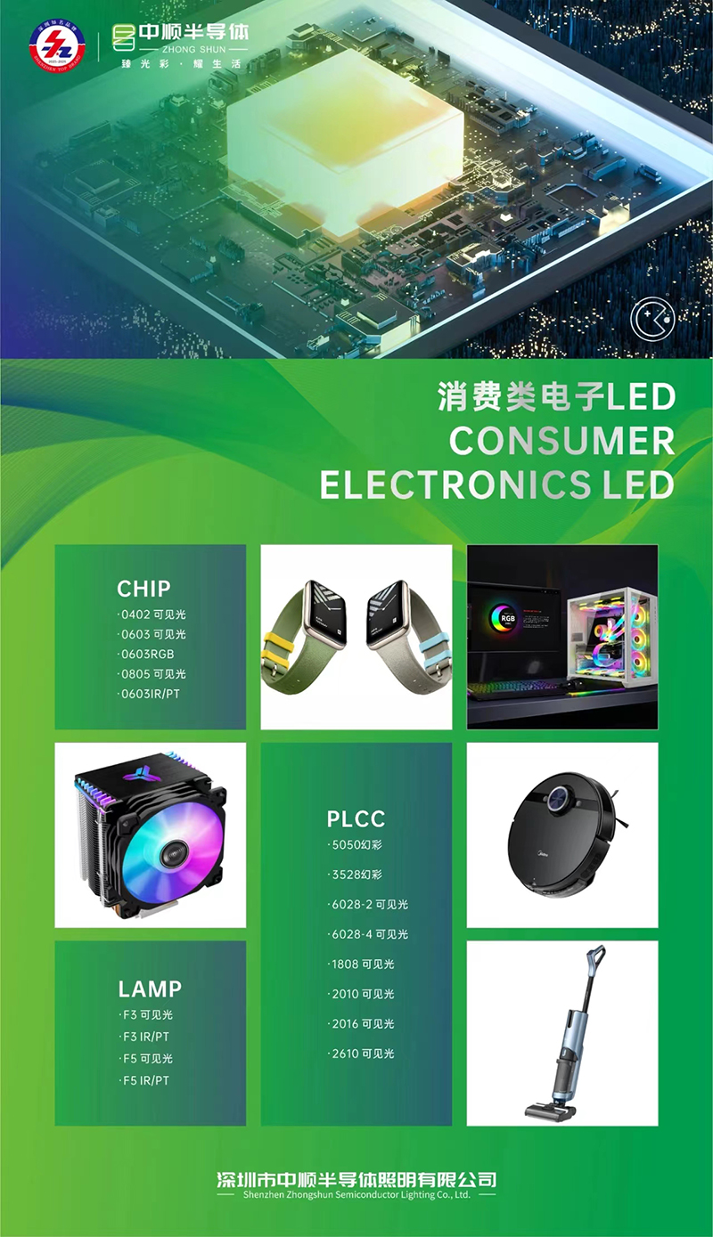 中順半導體消費類電子系列LED由于其體積小的特點,可廣泛應用各類小家電、電子穿戴產(chǎn)品、電競外設產(chǎn)品等等,相關產(chǎn)品工藝成熟,具備高亮度低功耗、低光衰、顏色一致性好等特點,且產(chǎn)品可接受多種客制化方案,為終端提供良好的產(chǎn)品體驗。