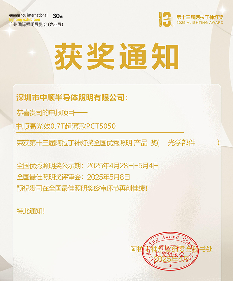 中順半導(dǎo)體榮獲2025第十三屆阿拉丁神燈獎(jiǎng)“四大區(qū)域優(yōu)秀獎(jiǎng)”和“全國(guó)優(yōu)秀照明產(chǎn)品獎(jiǎng)”