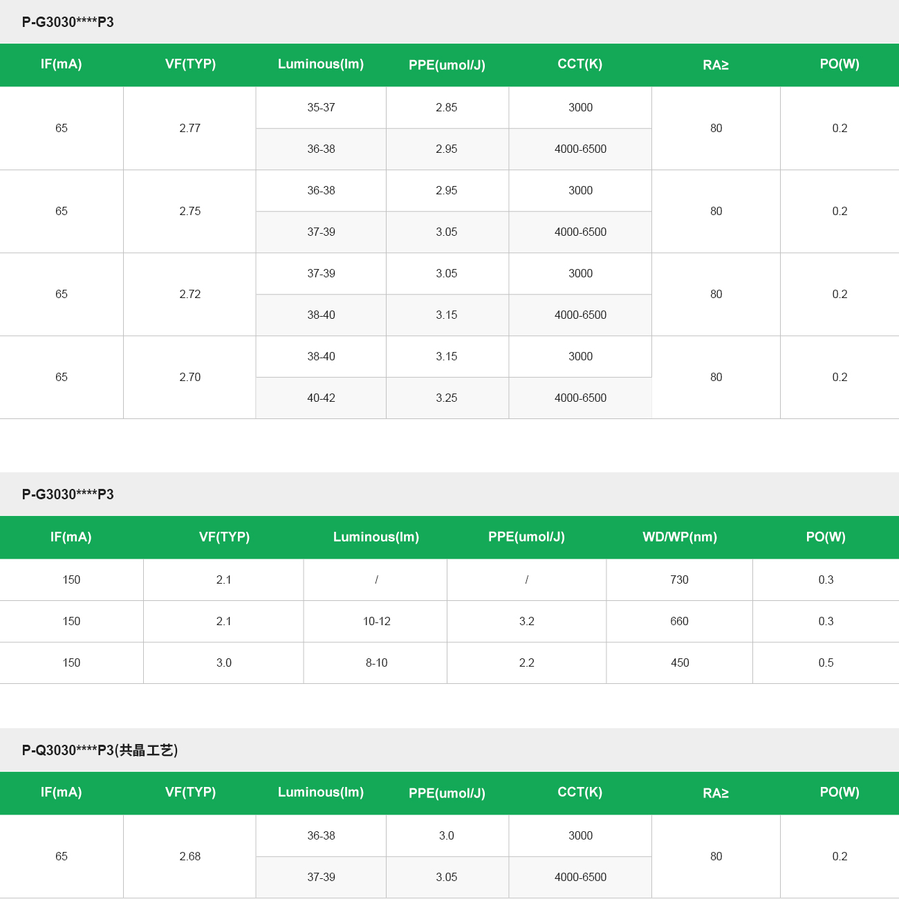 2.2-2.4PPE(umol/J)、2.95-3.0PPE(umol/J)